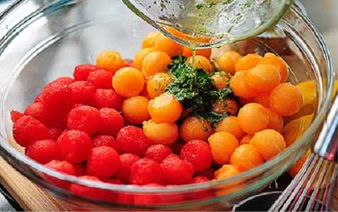 | Bước 2: Dùng cái múc kem, múc hai loại dưa hấu, bạn sẽ có những “viên salad” vô cùng đáng yêu và ngon mắt nhé. |