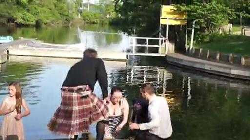Cô gái mải mê chụp ảnh cho cô dâu và chú rể nên trượt chân ngã xuống hồ.