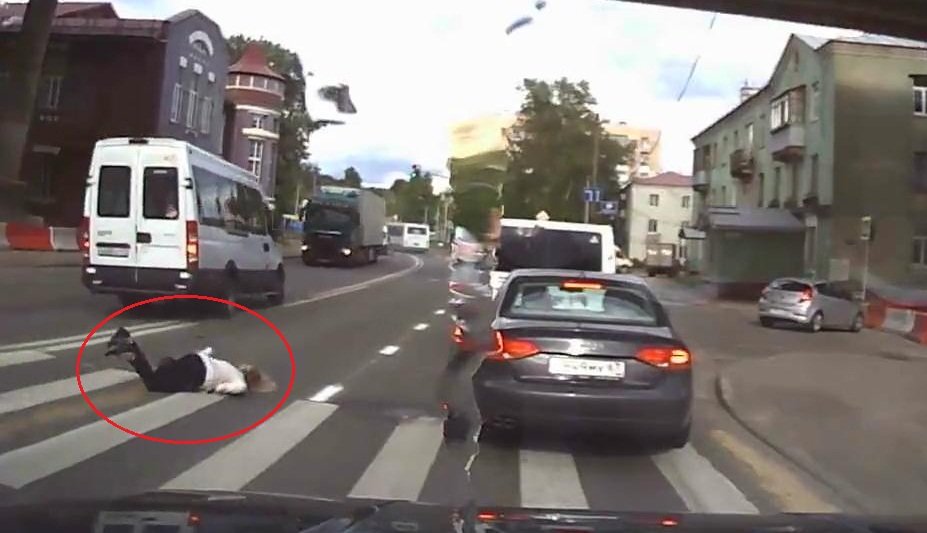 Người phụ nữ vừa đi bộ sang đường vừa nghe điện thoại, đâm sầm vào một ô tô rồi ngã nhào; sự việc xảy ra hôm 1/6 tại thành phố Smolensk, vùng Smolensk Oblast, Nga.