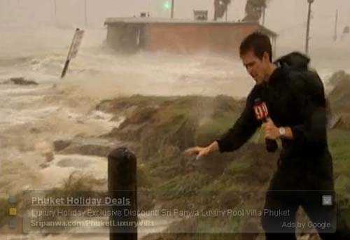 Mái nhà bay phía sau phóng viên trong bão Ike