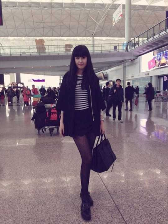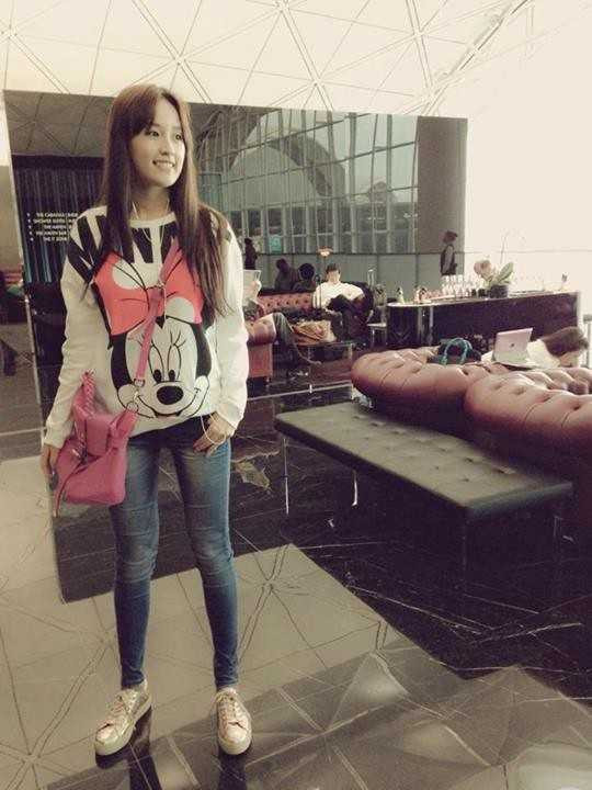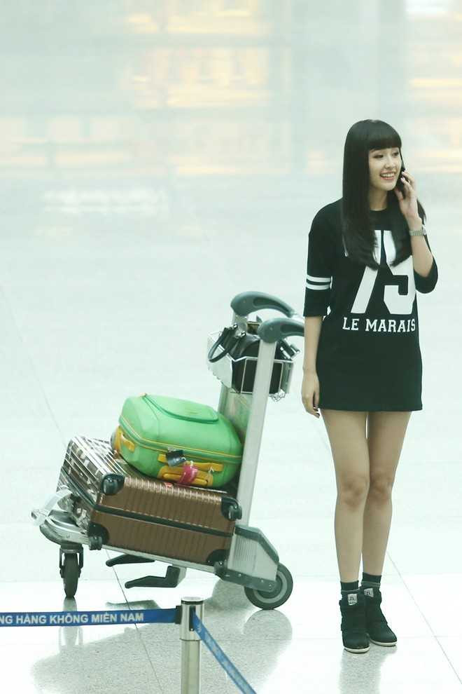 Cô cũng kết hợp rất nhuần nhuyễn áo số và mốt không quần khi diện kèm giầy độn.