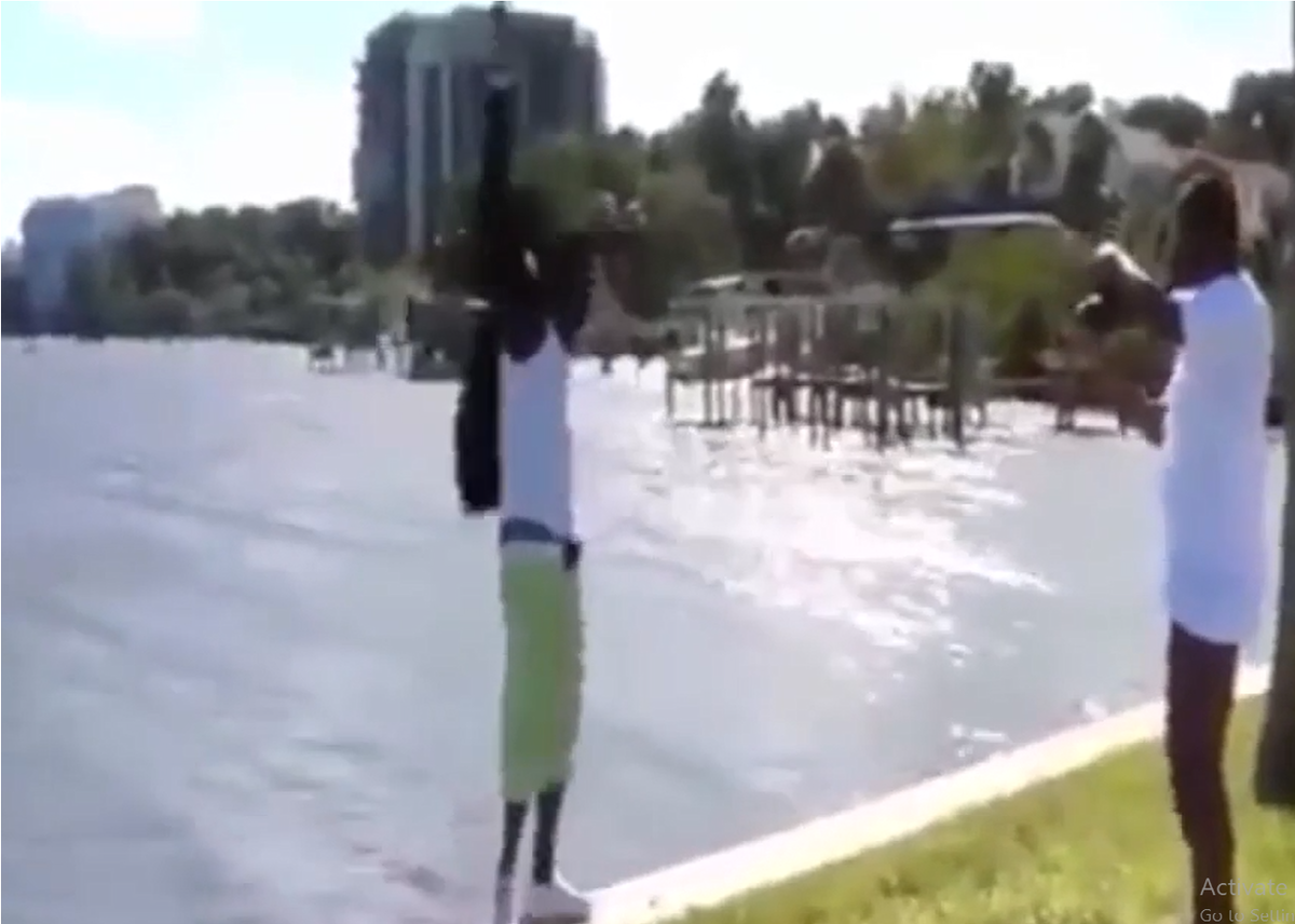 Cơn gió thổi bay chiếc mũ khiến chàng trai đang mải tạo dáng mất thăng bằng, ngã nhào xuống sông.