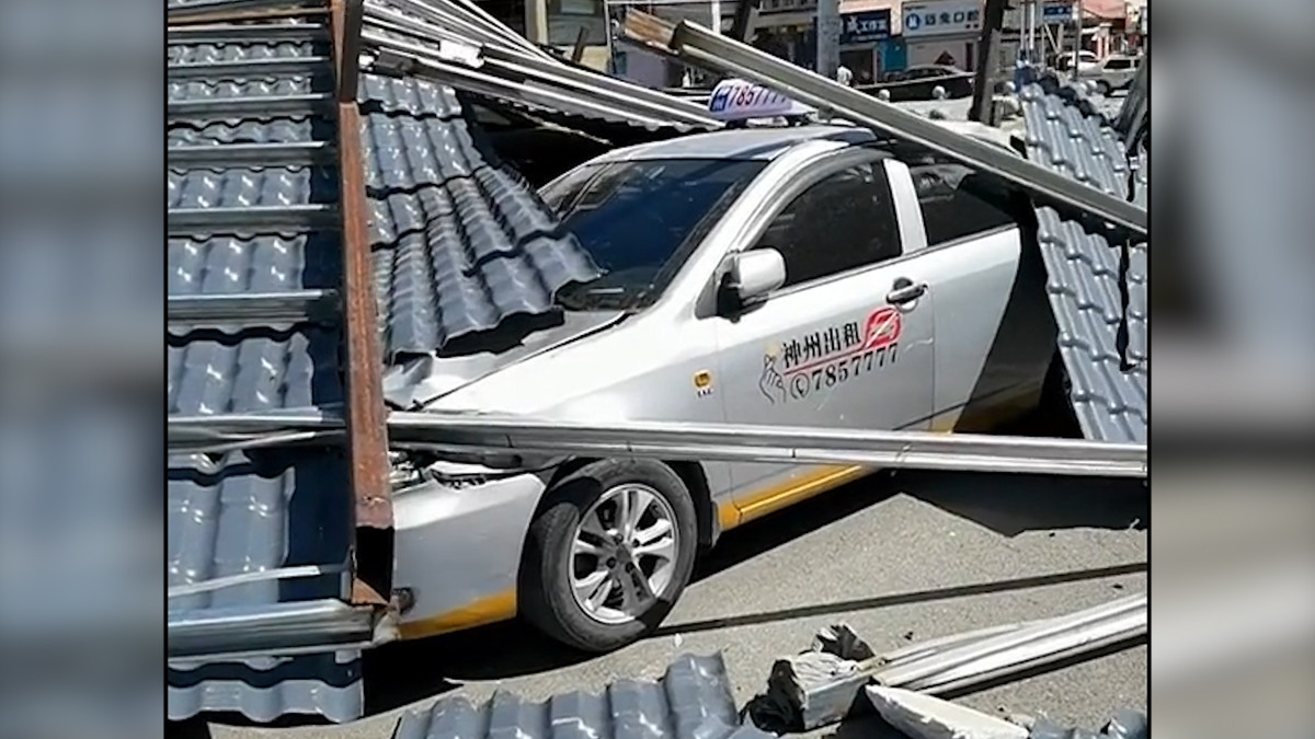 Cơn gió mạnh cuốn bay hàng loạt mái tôn, bảng hiệu và rơi như mưa xuống đất đè lên nhiều ô tô tại TP Bạch Sơn (Cát Lâm, Trung Quốc).