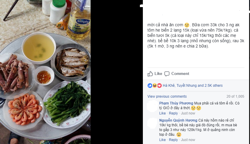 Khi đăng mâm cơm, tài khoản FB T.H viết: “Bữa cơm 33 ngàn cho 3 người ạ. Tôm he biển 2 lạng 15 ngàn (loại vừa nên 75 ngàn/1kg), cá biển tươi 5 ngàn (cá loại này chỉ 15 ngàn/1kg thôi các mẹ nhé). Bề bề 10 ngàn 3 lạng (nhỏ nhưng còn sống), rau 3 ngàn (5 ngàn 1 mớ, 3 người nên em chia 2 bữa).”