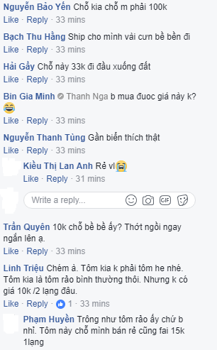 Bạn H.Bubi comment: “Mình ở Hải Hậu đây ạ. Tôm he bé cũng 20 ngàn/lạng rồi, tôm thuyền sống 100 ngàn/kg, tôm chết 30 ngàn. Rau cải 5 ngàn/bó, không bán 3 ngàn????”.