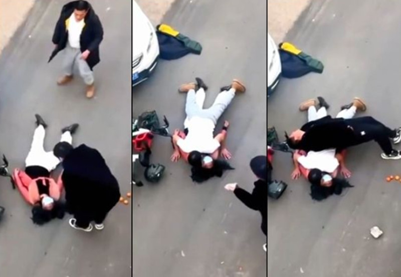Hiểu rõ đối phương đang chơi xấu, người lái ô tô cởi áo khoác, nằm đè lên nữ tài xế, ép chặt cô xuống đất. Người đàn ông đi cùng nữ tài xế ngơ ngác, choáng váng khi nhìn thấy cảnh tượng này, cuối cùng cũng nằm đè tiếp lên lưng nam tài xế. Cả ba tạo hình cảnh tượng "người chồng người" cực kỳ quái dị ngay trên đường.