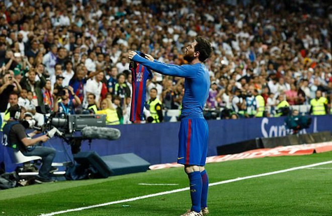 Tình huống chia vui của Messi diễn ra ở phút bù giờ cuối cùng hiệp hai, trong trận Kinh điển của La Liga cuối tuần qua. Sau khi ghi bàn quyết định đem lại chiến thắng 3-2, ngôi sao của Barca cởi áo và giơ lên trước mặt khán giả Real Madrid.