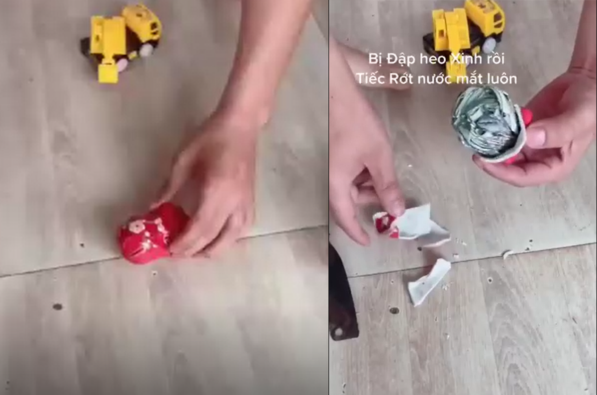 Theo đó, một gia đình nhỏ quay lại cảnh đập heo đất đón Tết của gia đình mình và khiến dân mạng đi từ bất ngờ ngày sang ngỡ ngàng khác. Ban đầu, ai nấy đều không khỏi chú ý bởi kích cỡ của heo đất rất nhỏ, chỉ bằng một bàn tay, khác hẳn với những chú heo đất mũm mĩm mà mọi người hay mua.