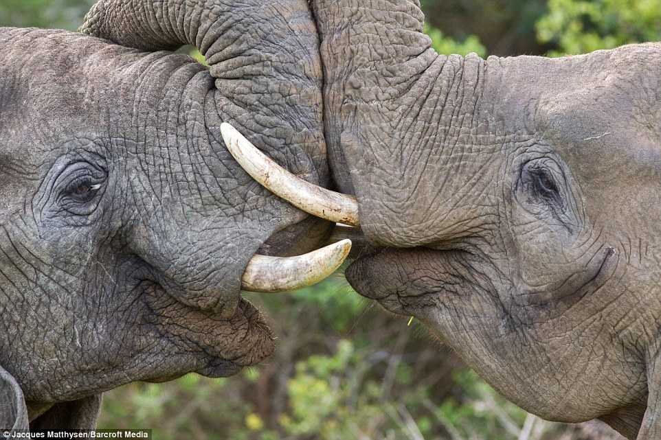 Đây là cảnh tượng hiếm hoi khi hai chú voi châu Phi trưởng thành quấn quýt, xoắn vòi vào nhau vô cùng tình cảm.