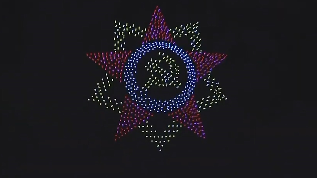 Hơn 2.000 chiếc máy bay không người lái tạo thành hình cánh chim hòa bình, con số 75, Huân chương chiến thắng, kỷ niệm 75 năm kết thúc Chiến tranh Thế giới thứ Hai.