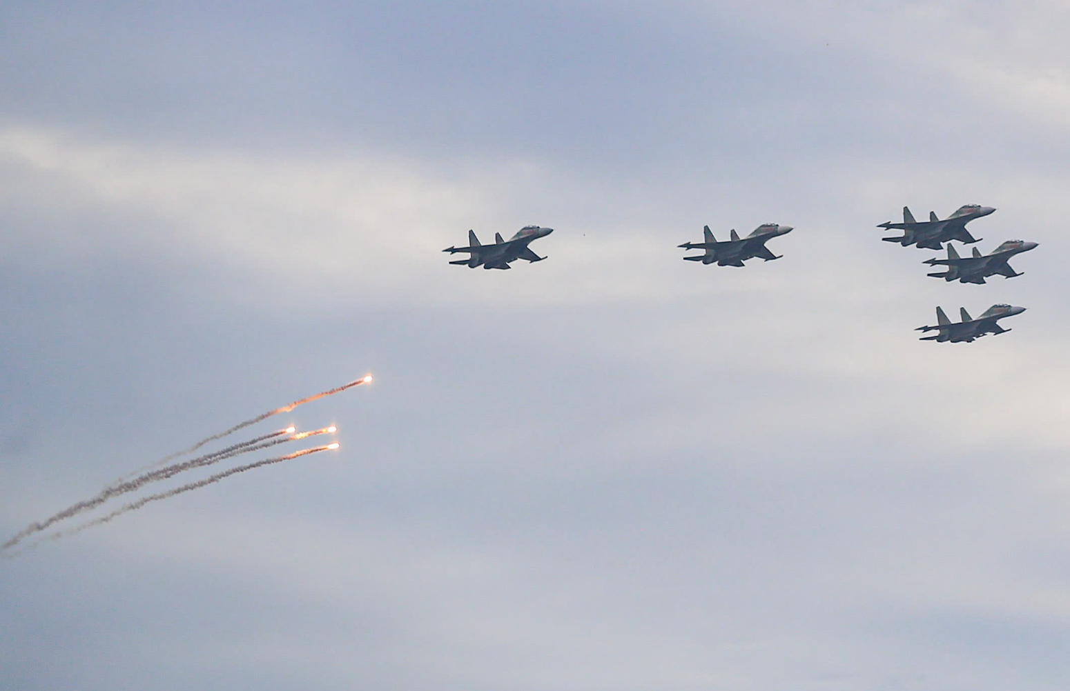 Sáng 30/8, mở đầu buổi tổng duyệt diễu binh diễu hành kỷ niệm 80 năm Quốc khánh, biên đội máy bay chiến đấu và trực thăng của Không quân nhân dân Việt Nam bay đội hình qua Quảng trường Ba Đình. Trong đó, ấn tượng nhất là màn thả mồi bẫy nhiệt của biên đội Su-30MK2.