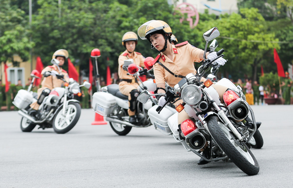 Chiếc xe đặc chủng phân khối lớn được các nữ học viên Học viện Cảnh sát Nhân dân vận hành thuần thục và uyển chuyển qua các bài biểu diễn đòi hỏi kỹ năng điêu luyện.