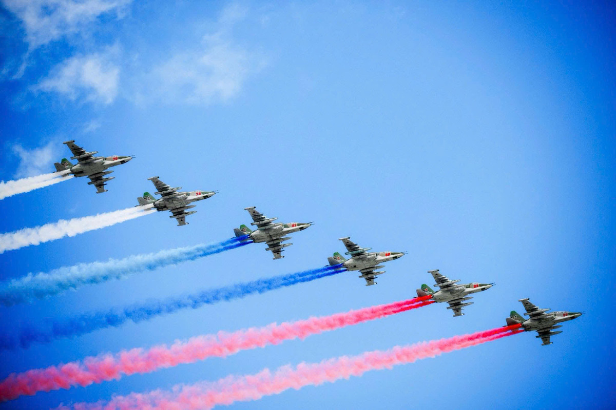 Máy bay chiến đấu Su-35 và MiG-29 của Nga mở màn phần trình diễn trên không trong duyệt binh Ngày Chiến thắng ở Nga, theo sau là 6 máy bay Su-25 kéo theo làn khói mang màu cờ Nga.
