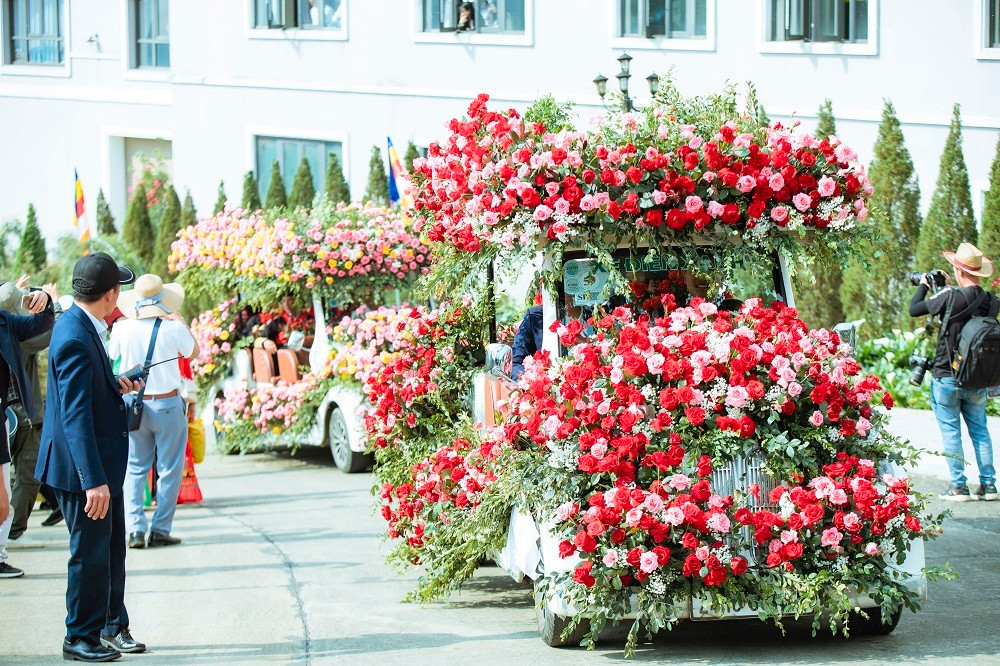 Màn diễu hành được thực hiện bởi 750 diễn viên là nghệ nhân dân gian và người dân Sa Pa cùng 34 chiếc xe trang trí lộng lẫy bằng hoa hồng của khu du lịch Sun World Fansipan Legend.