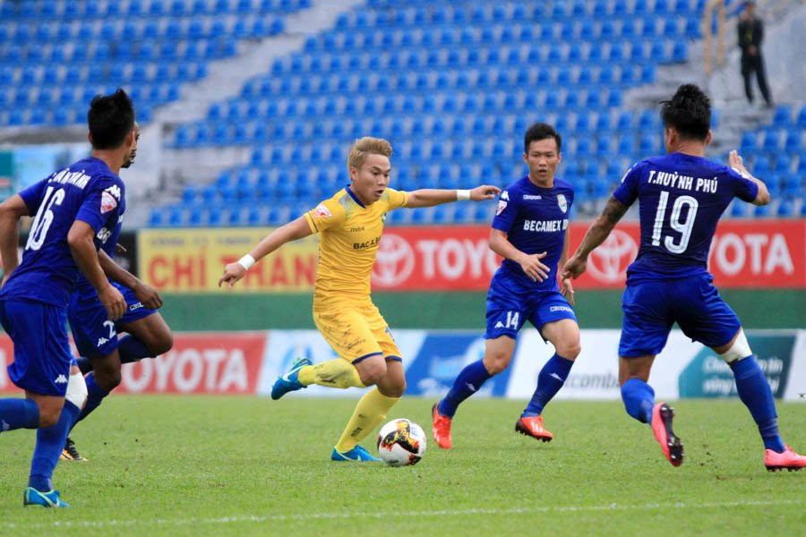 'Ronaldo xứ Nghệ' liên tục làm khổ hàng phòng ngự B.Bình Dương với những pha 'rang lạc' đặc trưng (Ảnh: Hoàng Tùng)