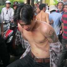 | Tên cướp với hình xăm, "chạm trổ" đầy người bị Minh Tiến bắt giữ trước sự chứng kiến đông đảo của người dân - ảnh: H.C |