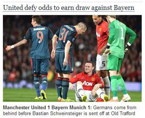Cùng chung quan điểm với Daily Mail, tờ Telegraph nhận xét: "United đã chơi kỳ quặc để kiếm một trận hòa trước Bayern." Tờ báo này cũng đặc biệt nhấn mạnh vào chiếc thẻ đỏ của Schweinsteiger, đồng thời cho rằng Quỷ đỏ ít nhất là đã có lợi thế ở trận lượt về.