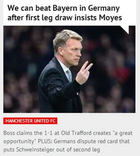 Tờ Mirror lại có cách trình bày khá đặc biệt. Họ không nhận định về trận đấu đêm qua, mà dùng chính lời phát biểu của David Moyes sau trận làm tiêu đề: "Chúng tôi có thể đánh bại Munich ở trận lượt về".