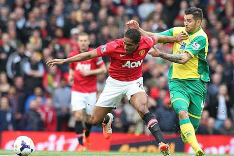 52' Thiếu chút nữa tỷ số là 3-0. Phil Jones có cơ hội đặt lòng ngay trong vòng cấm, nhưng pha đặt lòng của anh lại chạm chân hậu vệ Norwich.