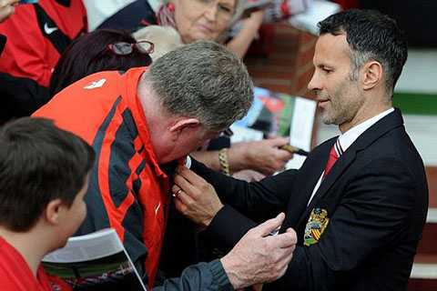 Ngay khi rời khỏi đường hầm sân Old Trafford, Ryan Giggs đã liên tục ký tặng các CĐV Man Utd. Có vẻ như anh đang cố gắng cứu vãn lại hình ảnh của CLB trong mắt mọi người.