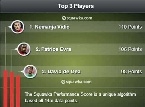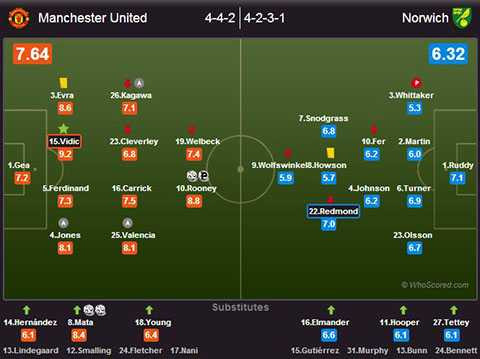 Chẳng phải ngẫu nhiên mà cả 2 trang web thống kê Whoscored và Squawka đều không đánh giá cao màn trình diễn của chân sút 28 tuổi - người được coi là đã mở ra chiến thắng trước Norwich cho Man Utd. Họ bị thuyết phục bởi Vidic: giải nguy 19 lần, đánh chặn 5 lần, không chiến thành công 100%; và Evra giải nguy 7 lần, xoạc 3 lần, và rê bóng thành công 3 lần (nhiều nhất trận).