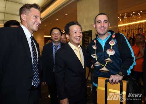 HLV trưởng Manuel Pellegrini xuất hiện đầu tiên ở cửa sân bay (Ảnh: Quang Minh)