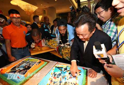 Bầu Hiển thắp nến lên bánh sinh nhật (Ảnh: Quang Minh)