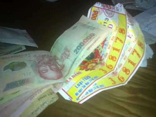 Đối tượng dùng 9 triệu đồng tiền thật để mua 23 triệu đồng tiền giả rồi đi mua vé số nhưng bị người dân phát hiện.