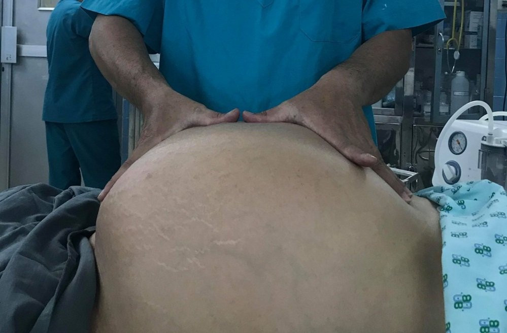 Bác sĩ Nguyễn Văn Tiến, Trưởng khoa Ngoại 1, Bệnh viện Ung Bướu TP.HCM cho biết, qua thăm khám, bác sĩ thấy bệnh nhân có vòng bụng lên tới 120cm, cơ thể nặng đến 80kg, nhưng thể trạng suy kiệt vì khối bướu lớn trong cơ thể.