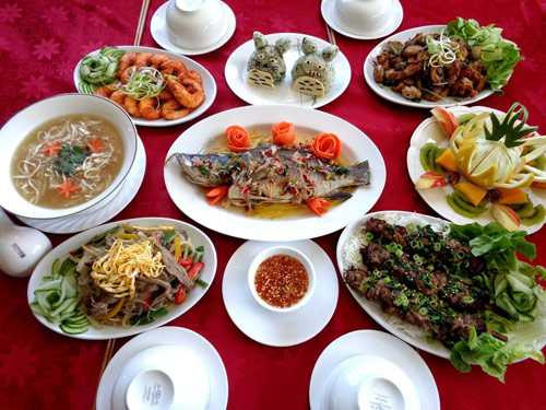 | Mâm cỗ được trang trí đẹp mắt nhưng vẫn giữ được hương vị truyền thống của dân tộc trên các món ăn của chị Ngân Hà (Thái Bình, Việt Nam). Mâm cỗ này theo chị Ngân Hà, chi phí khoảng 350.000 đồng cho các món mặn và 200.000 đồng tiền hoa quả. |