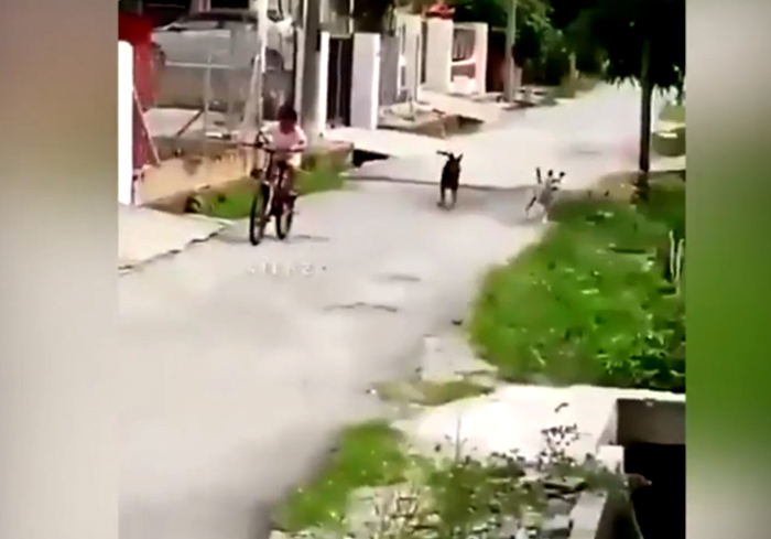 Đang đi xe đạp trên đường bỗng bị chó đuổi, cậu bé thông minh nhanh trí dọa cho chó ta chạy tóe khói.
