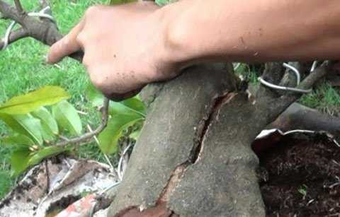 Tiếp đó, Minh lấy một khúc cây lớn hơn cổ tay và chỉ cưa một khúc dài 20cm kẹp giữa hai gốc mai suy. Xong công đoạn tạo dáng, Minh bắt đầu tiến hành các xảo thuật trét bùn vào giữa các kẽ hở.