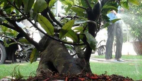 Sau đó, pha thuốc xịt nấm với liều đặc quánh để xịt vào gốc cho thân mai mọc rêu, che lấp những chỗ chắp vá. Chiêu thức này Minh thường sử dụng để chế ra những gốc mai lớn.