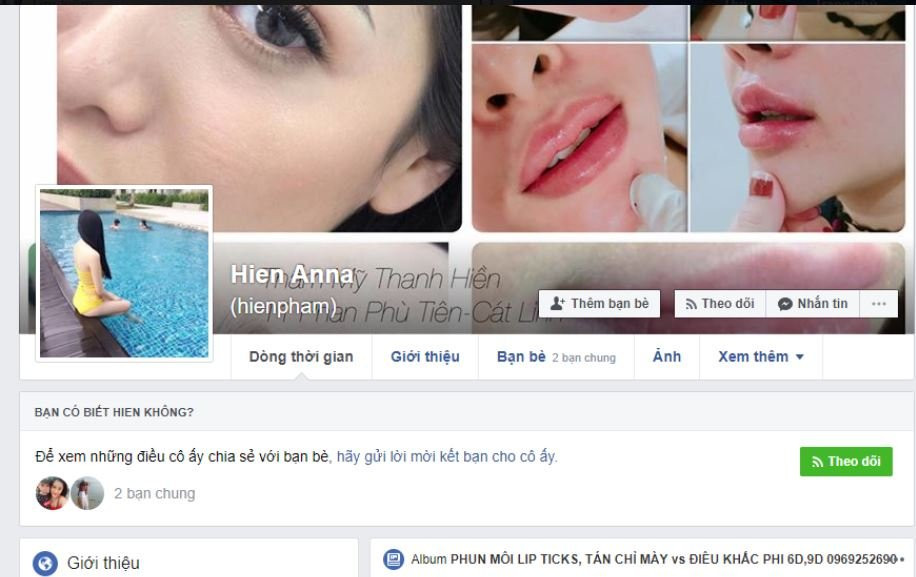 Cụ thể, trong hình ảnh của một số bệnh nhân gửi về, có chỉ ra thông tin về 2 facebook có tên là Misu Nguyễn (BS Thẩm Mỹ) và facebook Hien Anna. Cả 2 facebook này đều giới thiệu, quảng cáo về các dịch vụ thẩm mỹ, làm đẹp.