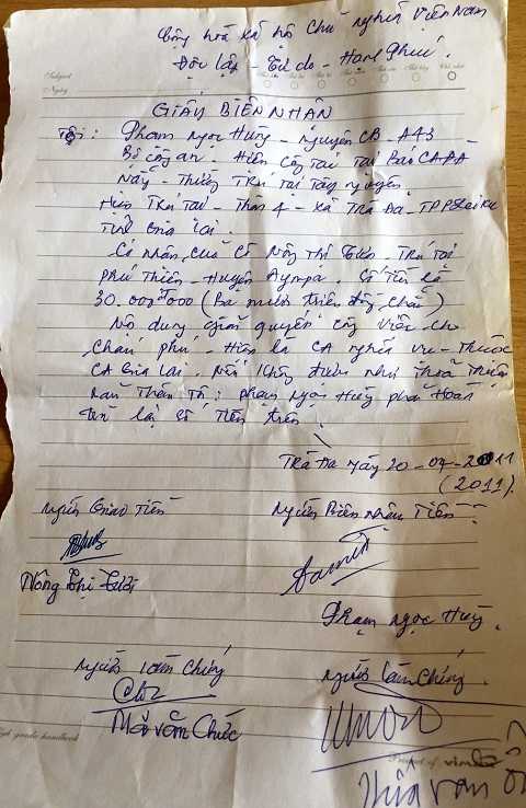 Điều đáng nói, để tạo lòng tin với gia đình bà Tươi, Hùng đã ghi vào 2 giấy biên nhận tiền ghi đơn vị công tác là cán bộ A43, Bộ Công an, hiện công tác tại Báo Công an TP Đà Nẵng – thường trú tại Tây Nguyên.
