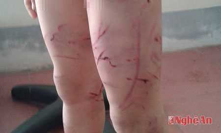 | Hai chân của cháu bị đánh đến thâm tím. |