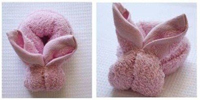 Bước 4: Gập hai đầu chiếc khăn ra phía sau và buộc cố định lại bằng một chiếc dây chun, phần này sẽ tạo thành hình tai thỏ. Bạn chỉnh lại phần đầu và tai thỏ cho đẹp.