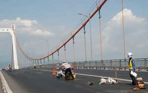 | Công nhân tiếp tục đục đẽo, trám vá các khe nứt tại lớp phủ mặt trên cầu Thuận Phước |