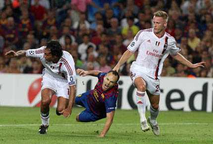 Iniesta dính chân thương ở trận đấu với AC Milan. |