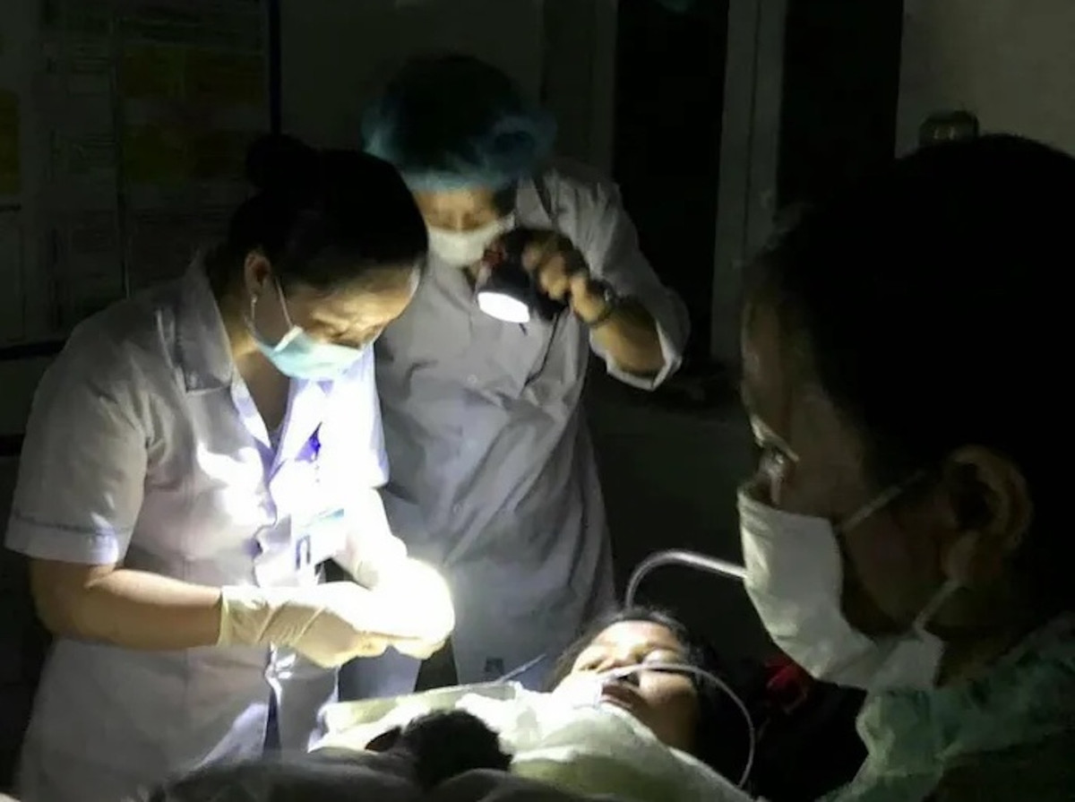 Bác sĩ ở Trung tâm y tế huyện Hướng hoá rọi đèn đỡ đẻ cho một sản phụ sinh.