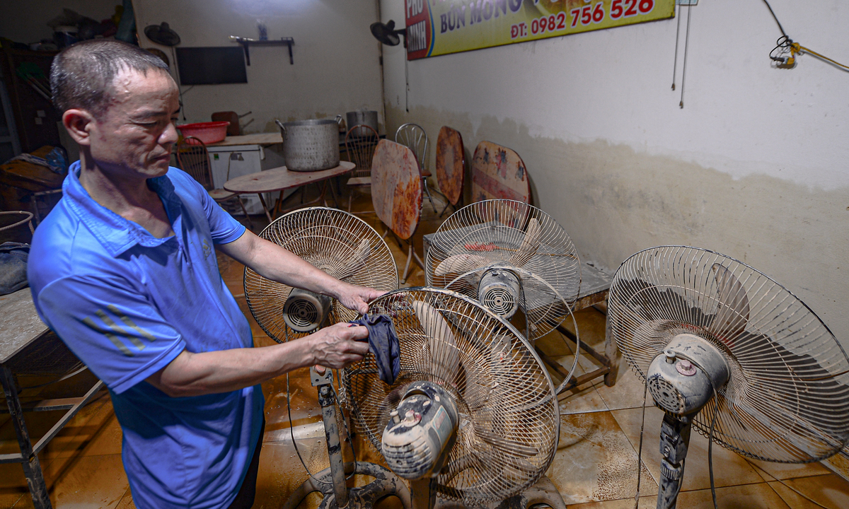 Gia đình ông Quang phải thuê thêm người hỗ trợ vì bùn đóng dày hơn 20cm. Ông kể, những ngày nước dâng, cả gia đình phải lên tầng 3 trú ngụ, chỉ mang theo ít đồ khô và nước uống. “Sáng nay mới dám xuống nhà. Tủ, giường, đồ điện hỏng hết. Mất điện lâu quá, không có nước sạch, giờ chỉ mong có lại điện để dùng máy bơm rửa bùn cho nhanh”, ông nói.