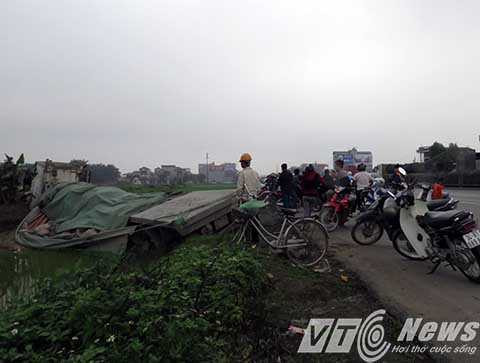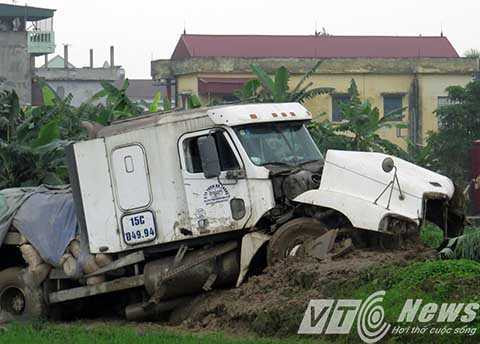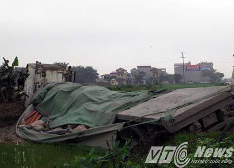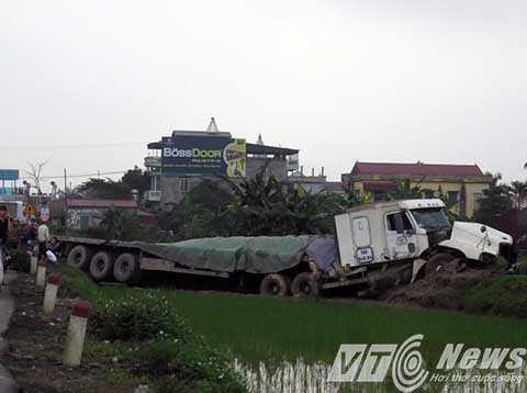 Đúng lúc này, xe sơ mi rơ-moóc, BKS đầu kéo: 15C-04994 phi xa gần 100m rồi lao xuống ruộng ven quốc lộ 5.
