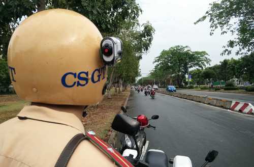 Chỉ vào chiếc camera nhỏ gắn một bên mũ, thiếu uý Nghĩa cho hay đã ghi được hình ảnh cô vi phạm và đề nghị hợp tác. Vẻ ngạc nhiên khi nhìn thấy thiết bị trên mũ và tay của anh cảnh sát trẻ, cô gái phân bua “em tưởng lúc băng qua đèn còn vàng” rồi ký vào biên bản vi phạm.