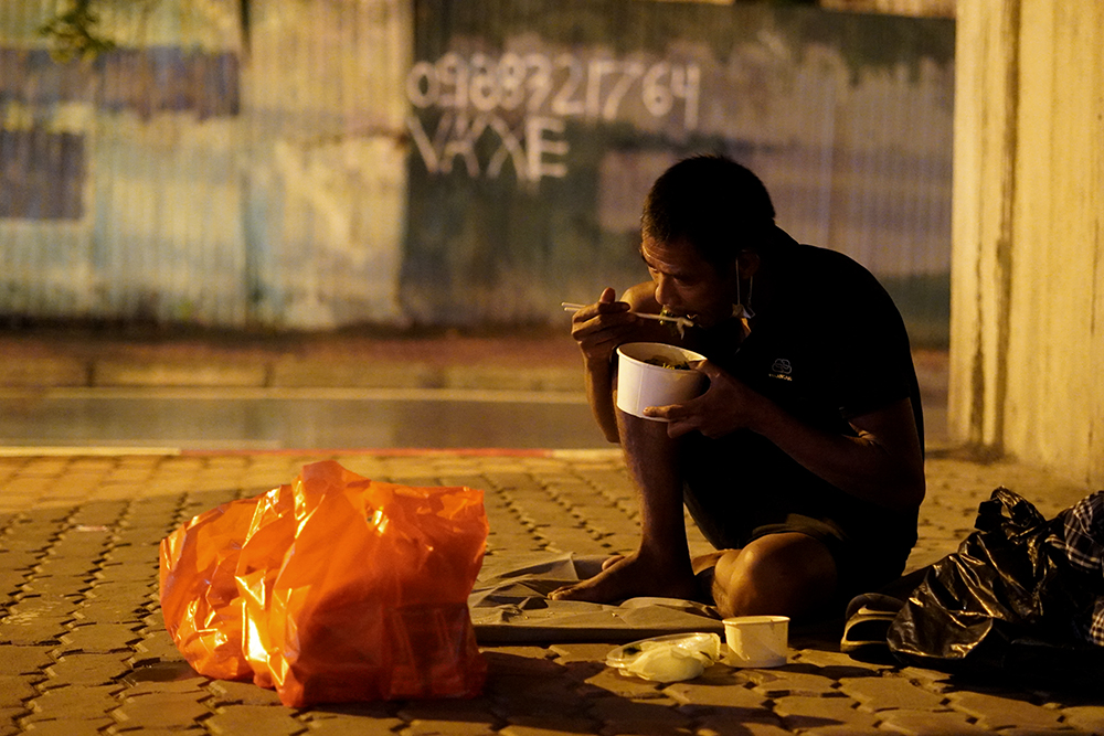 23h, ngồi bên gầm cầu Nguyễn Chánh (Hà Nội), dưới cơn mưa nặng hạt, anh Nguyễn Văn Tục (lao động tự do, quê Điện Biên) đang với nhìn theo những người thiện nguyện vừa cho mình suất cơm ăn chống đói qua ngày. Đã 12 tiếng trôi qua, bây giờ anh mới có cái để lót dạ. Nhóm công nhân quê anh do dịch bệnh mà đi bộ về Điện Biên hết, còn mỗi anh phải ở lại vì chân đau không thể đi xa được.