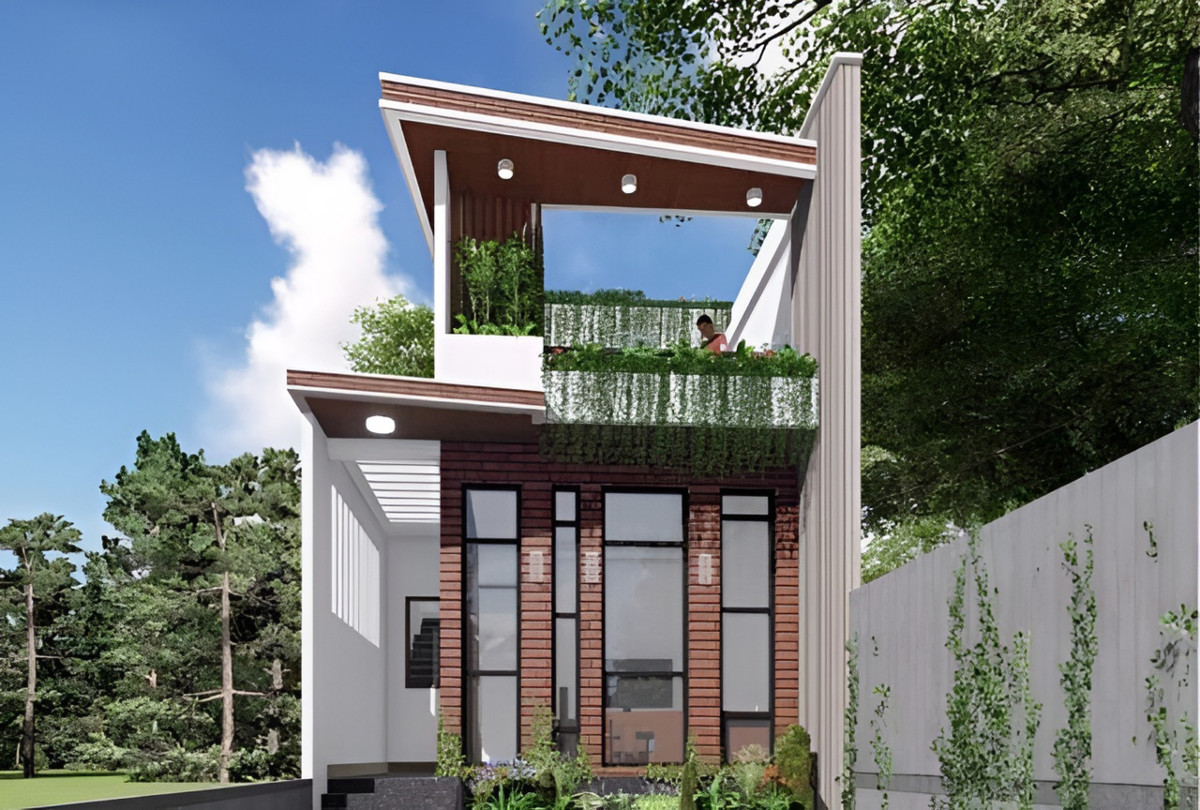 Bạn có thể xây thêm một tầng tum ở bên trên để làm phòng ngủ. Ở phía trước, thiết kế phần mái bằng giúp ánh sáng chiếu đến ngôi nhà không bị che khuất. Tuy nhiên, để tránh hướng mặt trời mọc, các kiến trúc sư đã xây dựng thêm một bức tường chắn nắng.