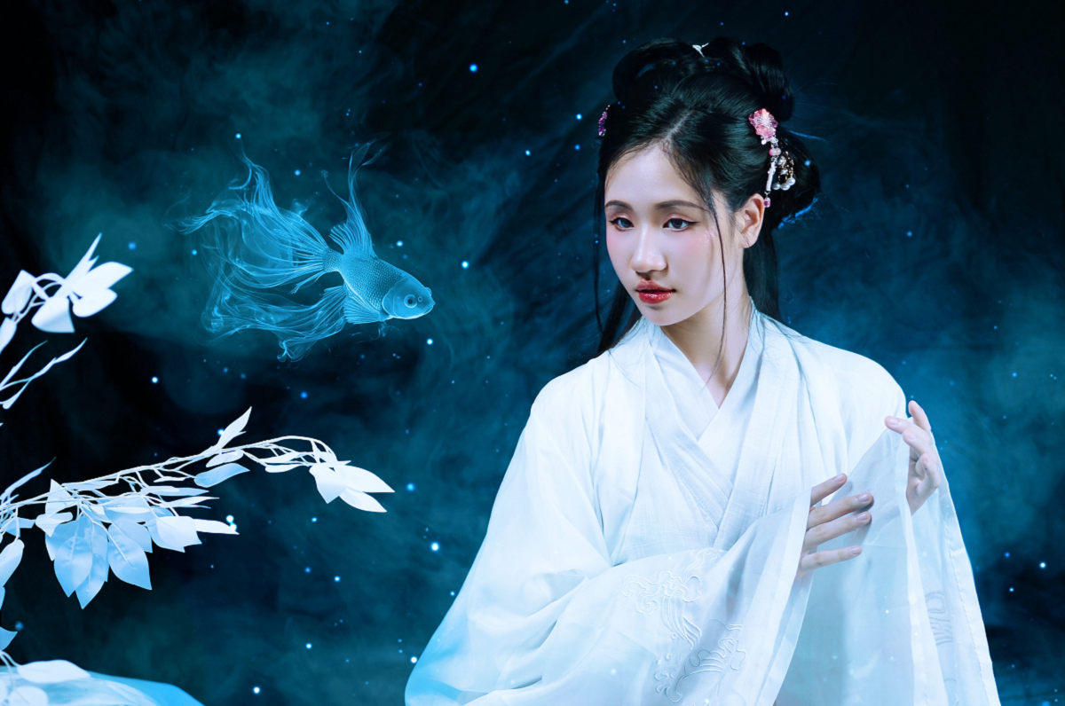 Diện trang phục cổ trang màu trắng có tên "nguyệt sắc" giúp Minh Anh dễ dàng hóa thân thành cô thiếu nữ thời xưa đang mơ màng thưởng trăng.