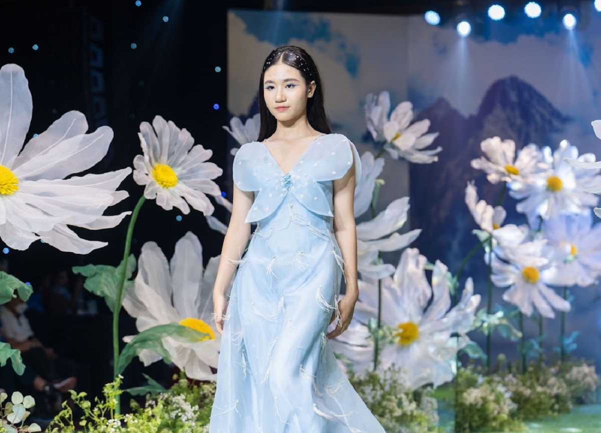 Những bước catwalk uyển chuyển cực kỳ phù hợp với bộ trang phục nhẹ nhàng, tươi sáng và khung cảnh được trang trí cầu kỳ trên sàn diễn khiến Minh Anh vô cùng nổi bật.