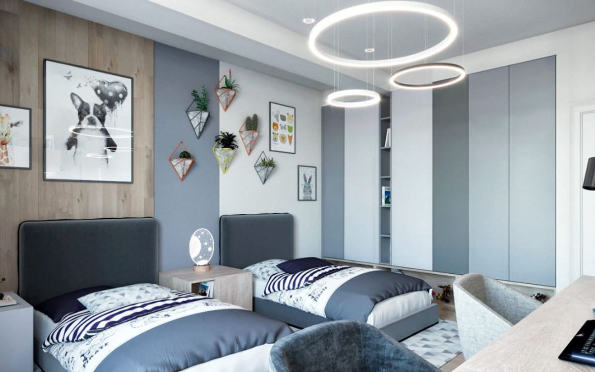 Bạn hoàn toàn có thể lựa chọn 2 màu khác nhau để tạo điểm nhấn cho căn phòng. Giường ngủ, bàn học của mỗi người sẽ có màu sắc riêng thể hiện cá tính riêng của từng bé.