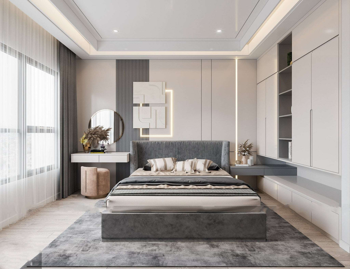 Thiết kế nội thất phòng ngủ theo phong cách hiện đại lấy tone màu xám làm màu chủ đạo. Phối hợp nhuần nhuyễn giữa các chất liệu cao cấp như nhung, kim loại, nhựa,... tạo nên thiết kế phòng ngủ đẹp mắt, sang trọng.