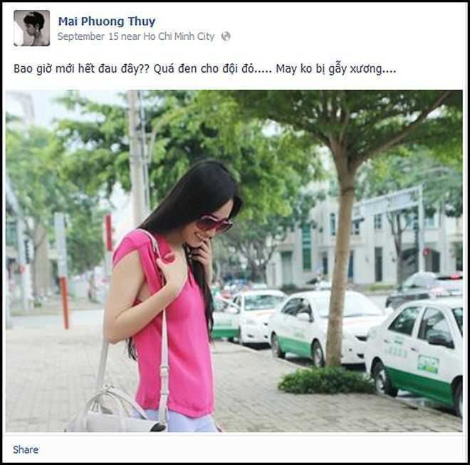 Hai tháng trước vụ Mai Phương Thúy bị giật túi, quán quân The Voice mùa đầu tiên than thở trên trang cá nhân về chuyện mất điện thoại khi đang dạo phố. Cô chia sẻ hình ảnh chụp cùng chiếc điện thoại cũ và viết: 'Nguyên văn đây là hình ảnh cuối cùng của cái điện thoại thân yêu của em'.